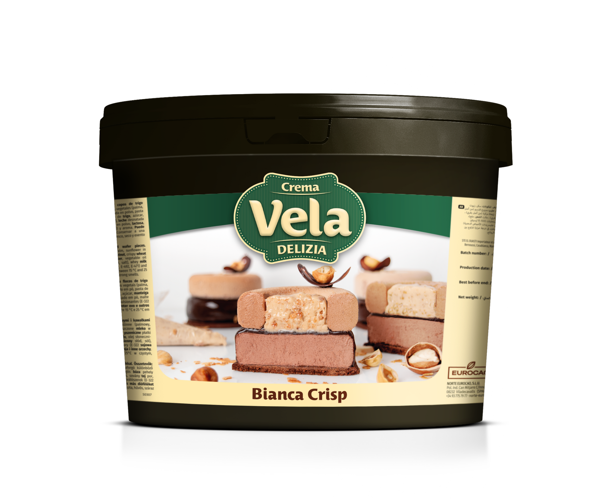 Crema Vela Bianca Crisp, Weiße Haselnuss, kommt im 6kg-Eimer und ist ein leckeres Topping auf Desserts - egal ob Waffeln, Crepes, Pfannkuchen oder Milchshakes.